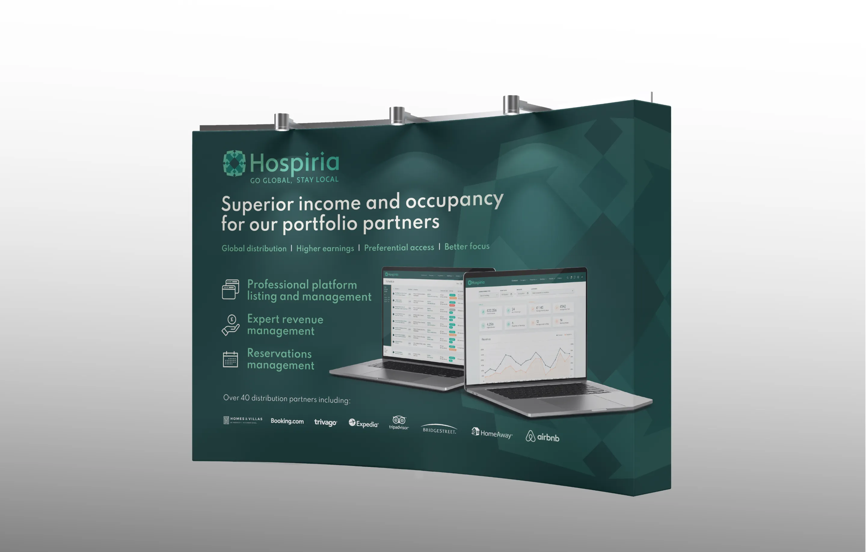 Next came Hospiria, born out of the deep understanding the UnderTheDoormat team had gleaned from managing property, we set about helping them design a property management tool, the brand and all of the marketing materials that went along with it, from illustrations of features to the app itself, exhibition stands and much more besides.